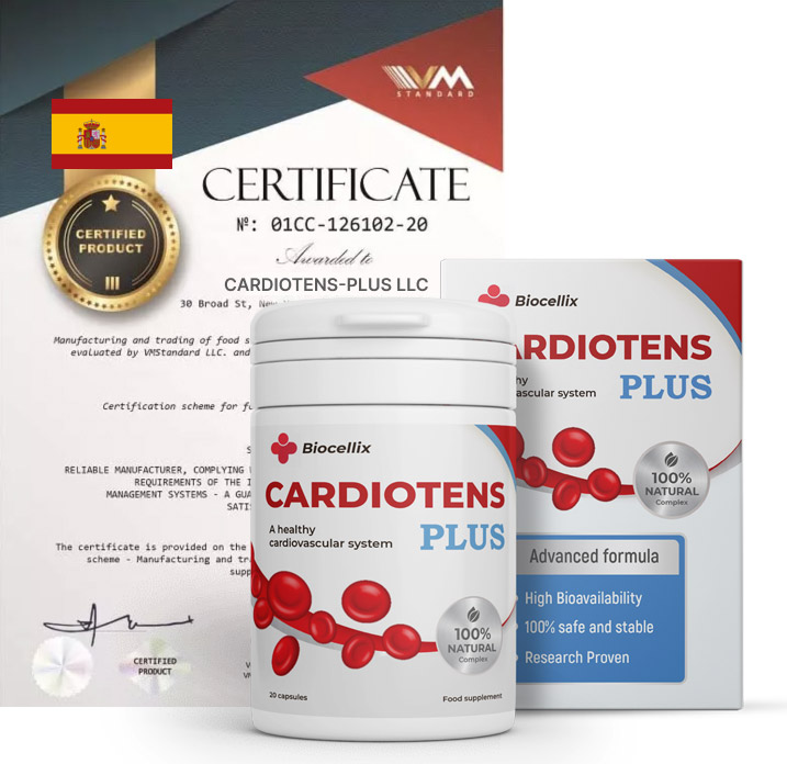 - Hasta la fecha, solo hay un medicamento en España que hace bien esta tarea. Se llama Cardiotens Plus . Este fármaco fue creado en 2021 por el Instituto Vascular y Cardíaco. El medicamento contiene aproximadamente 40 componentes activos: extractos de plantas útiles para los vasos sanguíneos, vitaminas, micro y macroelementos.
